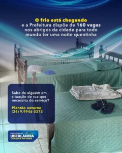 #DesenvolvimentoSocial | Com a chegada do frio, a Prefeitura de Uberlândia reforça o acolhimento à população em situação de rua, oferecendo 160 vagas nos abrigos da cidade. Equipes especializadas estão nas ruas, prestando apoio, orientação e encaminhamento para garantir uma noite segura e quentinha a quem mais precisa. Se souber de alguém que necessite do serviço, entre em contato pelo (34) 9.9946-0373.
