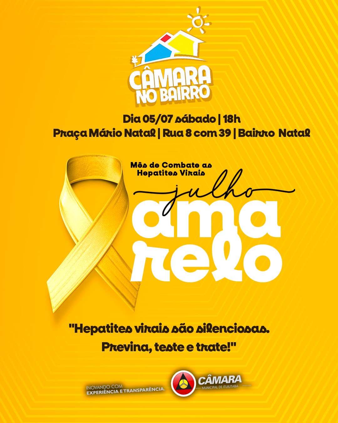Mais uma edição do Câmara no Bairro será realizada neste sábado, 05/07, a partir das 18 horas, na Praça Mário Natal, no Bairro Natal.