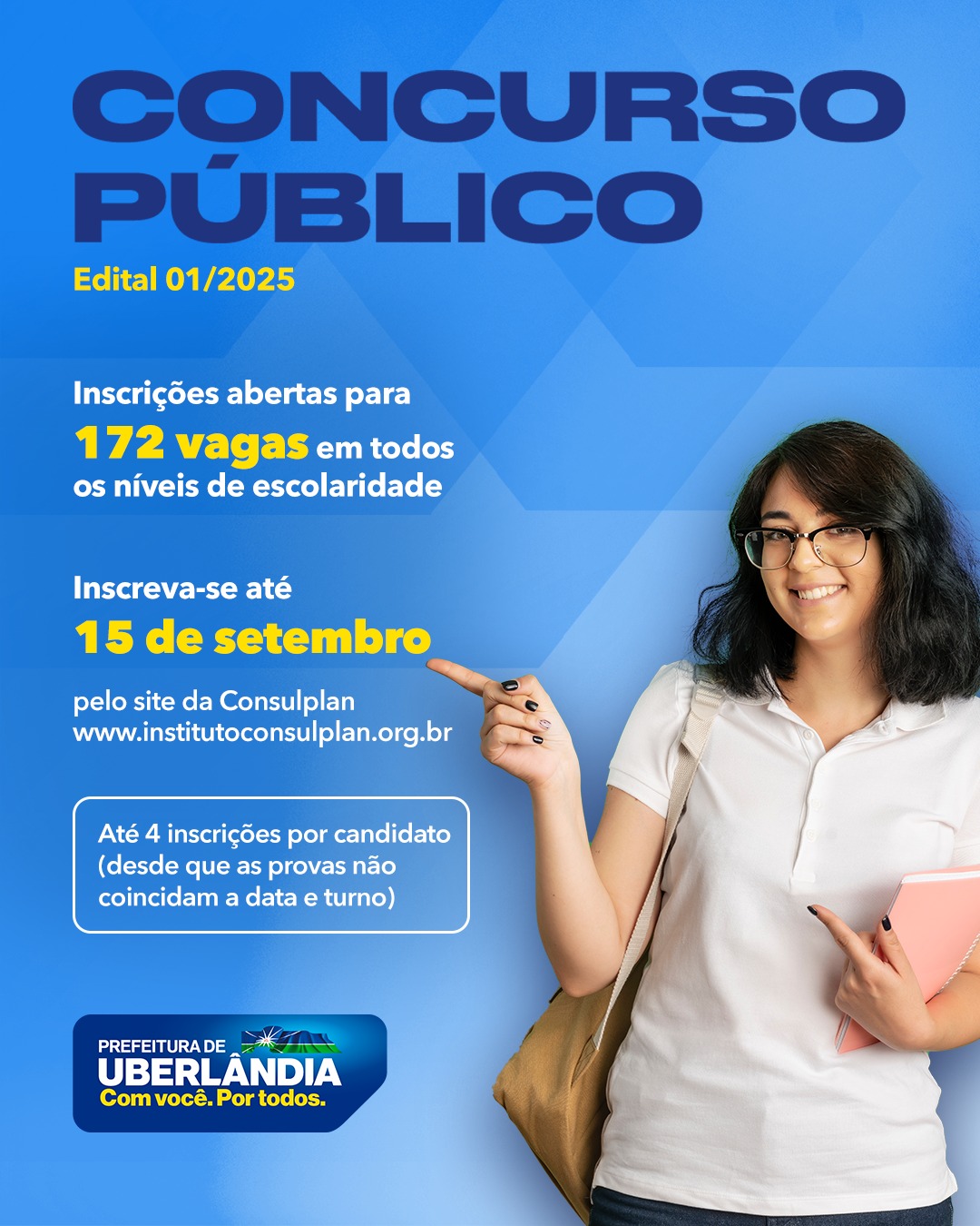 #Administração | Estão abertas as inscrições para o Concurso Público da Prefeitura de Uberlândia. São 172 vagas mais cadastro reserva em diferentes níveis de escolaridade. Os interessados podem se inscrever até 15 de setembro pelo site da Consulplan. Cada candidato pode fazer até quatro inscrições, desde que as provas não coincidam na data e no turno. Participe www.institutoconsulplan.org.br