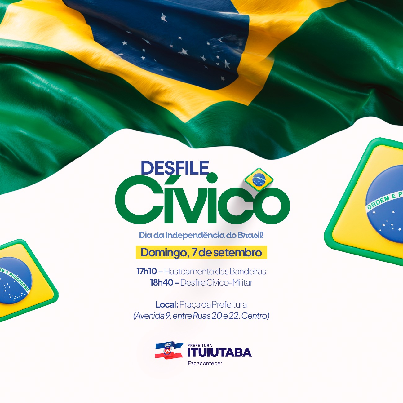 A Prefeitura de Ituiutaba, por meio da Secretaria de Educação, Esporte e Lazer, realiza no próximo domingo, 7 de setembro, as atividades em comemoração ao Dia da Independência do Brasil. A programação inclui hasteamento das bandeiras às 17h10 e desfile cívico-militar a partir das 18h40 na Praça da Prefeitura, com a participação de instituições educacionais, forças de segurança e grupos culturais.