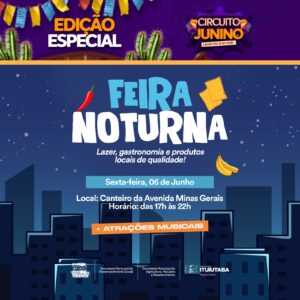 A Prefeitura de Ituiutaba, por meio das Secretarias de Agricultura, Pecuária e Abastecimento, de Desenvolvimento Social e da Fundação Cultural, realiza nesta sexta-feira, 6 de junho, edição especial da Feira Noturna, evento que reúne gastronomia, cultura e produtos locais. A edição marcará o lançamento do Circuito Junino e será realizada das 17h às 22h, no canteiro central da Avenida Minas Gerais.