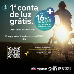 A iniciativa oferece a primeira conta de luz gratuita e descontos mensais de até 16% para quem aderir ao serviço. A ação integra a campanha promocional da Cemig SIM e busca estimular a geração e o consumo de energia limpa, renovável e sem necessidade de instalação de painéis solares.