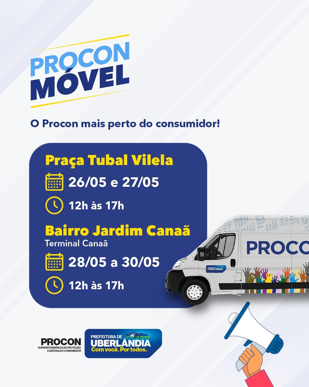 #Procon | O Procon de Uberlândia está mais perto de você! Nesta semana, a unidade itinerante atenderá na Praça Tubal Vilela, nos dias 26 e 27 de maio, e no Terminal Canaã, de 28 a 30 de maio, sempre das 12h às 17h. É a sua chance de tirar dúvidas e resolver questões de consumo com mais praticidade e perto da sua casa!