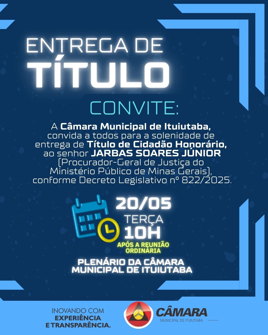 O Plenário da Câmara Municipal terá nesta terça-feira, 20 de maio, às 10 horas (logo após o encerramento da Reunião Ordinária), da solenidade de entrega do título de Cidadania Honorária ao Exmo. Procurador-Geral de Justiça do Ministério Público de Minas Gerais, senhor JARBAS SOARES JÚNIOR, conforme Decreto Legislativo nº 822 de 2025.