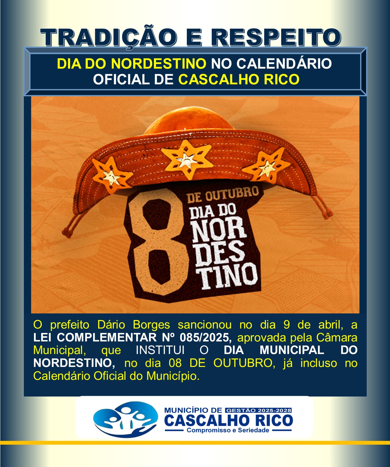 O prefeito Dário Borges sancionou no dia 9 de abril, a LEI COMPLEMENTAR Nº 085/2025, aprovada pela Câmara Municipal, que INSTITUI O DIA MUNICIPAL DO NORDESTINO, no dia 08 DE OUTUBRO, já incluso no Calendário Oficial do Município.