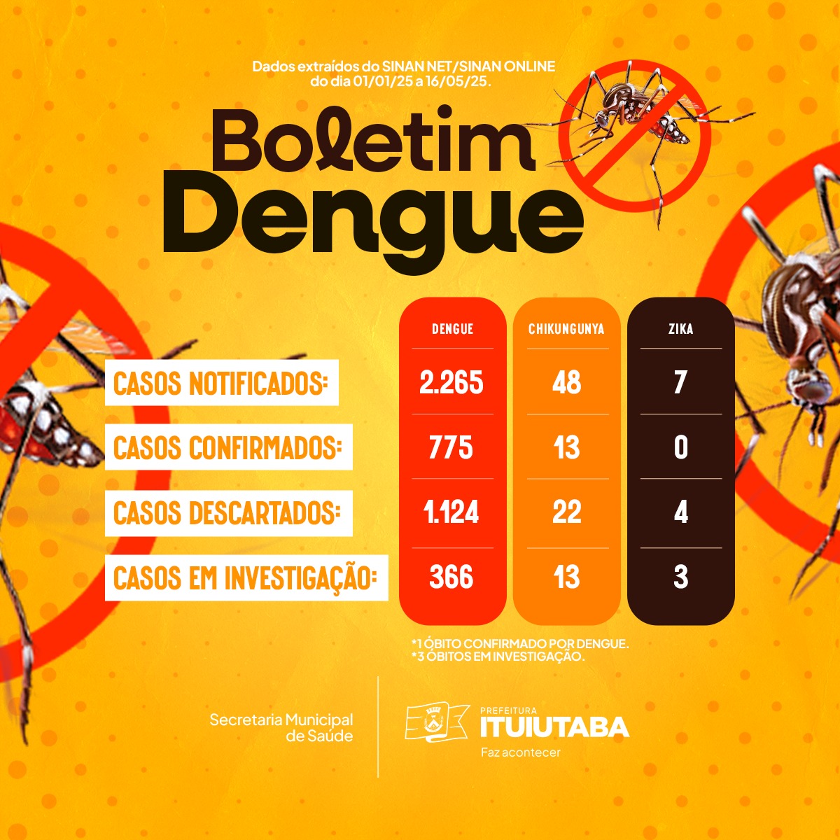 A Prefeitura de Ituiutaba, por meio da Secretaria de Saúde, intensifica as ações de prevenção e diagnóstico precoce da dengue, chikungunya e zika. O município já registrou 2.265 notificações de dengue entre 1º de janeiro e 16 de maio de 2025, segundo dados do Sistema de Informação de Agravos de Notificação (SINAN NET/SINAN ONLINE).